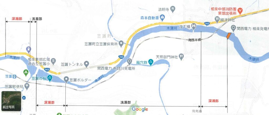 また、11月17日・18日は上記地図で示された相楽発電所堰堤から笠置キャンプ場までの範囲で流失した決しゃ版の回収工事が行われる予定です(作業予備日:12月2日~5日)
