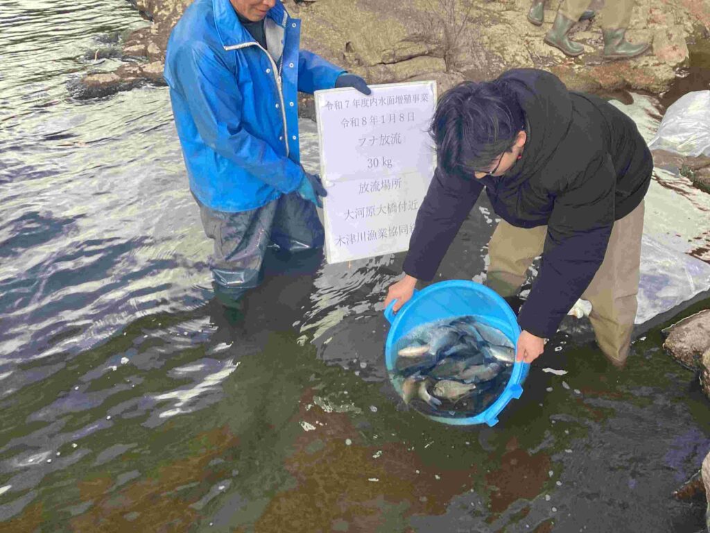 2026年1月8日(木) 高山ダム⑧・⑬組合員看板・木津川本流の大河原大橋付近にてフナ総数150㎏を放流しました。