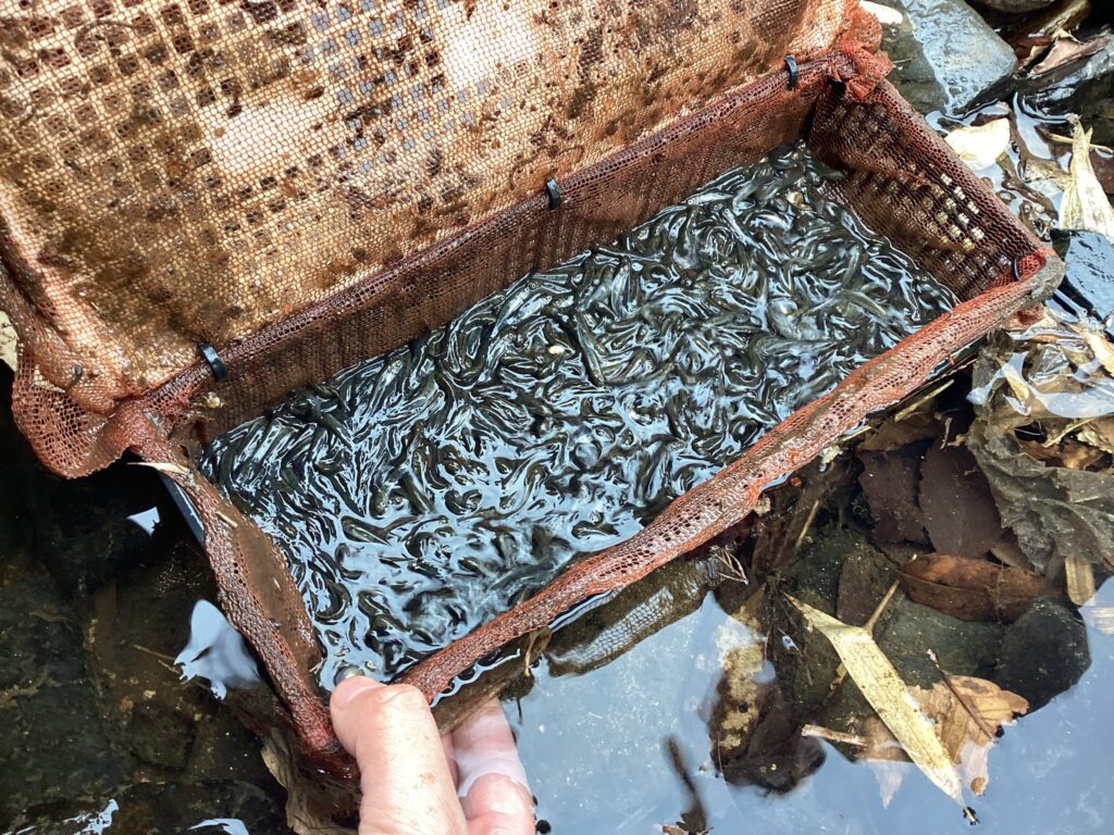 現在、発眼卵から孵化したアマゴ稚魚は各支流で元気に泳いでおります。このまま順調に生息して大きくなれば、来シーズンの解禁からは沢山のアマゴが棲める川で魚釣りをお楽しみ頂けるものと期待しております。今シーズンも小さなアマゴをあちこちで見かけるかもしれませんが、12㎝以下は採捕できませんので温かく見守って頂けると幸いです。